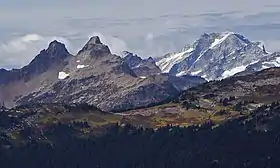 Sitting Bull Mountain is a 7,759-foot (2,365-metre) double summit mountain in the North Cascades of Washington state. The north summit is higher than the south peak (7680+ ft), and easier to climb (class 3 vs. class 4), however neither peak sees much climbing activity.[3] Sitting Bull Mountain is located 2.1 mi (3.4 km) northwest of Suiattle Pass in the heart of the Glacier Peak Wilderness. Its nearest higher peak is Plummer Mountain, 1.51 mi (2.43 km) to the south-southwest.[1] The mountain is situated on the crest of the Cascade Range, on the shared border of Snohomish County and Chelan County. Precipitation runoff from Sitting Bull Mountain drains east into Agnes Creek which is a tributary of the Stehekin River, or west into Canyon Creek which is a tributary of the Suiattle River.