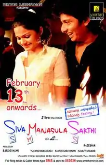 Siva Manasula Sakthi (lit. 'Sakthi in Siva's heart') also known by the initialism SMS,[1] is a 2009 Indian Tamil-language romantic comedy film written and directed by debutant M. Rajesh, a former assistant of director S. A. Chandrasekhar. It stars Jiiva and newcomer Anuya Bhagwat, a student of Pune Film Institute, in the lead roles, with Santhanam, Urvashi and Sathyan appearing in supporting and Arya appearing in a cameo role. Despite initially gaining mixed reviews, the film became highly successful at the box office and has since become a cult romantic comedy film in the Tamil film industry. The film was later remade in Telugu as Shiva Manasulo Shruti with Mahesh Babu's brother-in-law Sudheer Babu and Regina Cassandra and released in February 2012. The film's soundtrack by Yuvan Shankar Raja was extremely popular and hailed as a blockbuster.