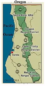 The Six Rivers National Forest is a U.S. National Forest located in the northwestern corner of California. It was established on June 3, 1947 by U.S. President Harry S. Truman from portions of Klamath, Siskiyou and Trinity National Forests. Its over one million acres (4,000 km2) of land contain a variety of ecosystems and 137,000 acres (550 km2) of old growth forest.[1] It lies in parts of four counties; in descending order of forestland area they are Del Norte, Humboldt, Trinity, and Siskiyou counties. The forest is named after the Eel, Van Duzen, Klamath, Trinity, Mad, and Smith rivers, which pass through or near the forest's boundaries.
