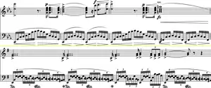 Like the second and fourth pieces, number six is written in the form of an étude, with a repetitive but technically challenging chordal melody that is doubled in both hands.[2] In all, the work has three distinct elements played simultaneously: the main melody, the continuous thirty-second note broken chord figures, and a descending eighth note motif.[14] Dynamics play a large part in this piece: the fortissimo marked at the beginning is maintained all throughout the first section, with only brief respites to mezzo forte.[14] The middle section is wholly softer, and contains two areas with significant mounting tension, creating the aforementioned "apotheosis effect" with dramatic "false starts."[9] Here, Rachmaninoff manipulates the theme contrapuntally to develop a canonic effect. This "triple counterpoint... is titanic both in size and impact, and in potential for disaster,"[9] referring to the tension, waiting for the final climax, in this "continuing explosion."[1] Immediately before the coda, the thick texture and canon suddenly disappear and the piece becomes piano. Upon entering the coda, the work resumes the forte theme and amalgamates to a majestic ending played fortississimo.[14]