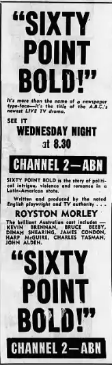 Sixty Point Bold is a 1959 Australian television play which aired on ABC. It was produced by the Sydney station of the network, ABN-2, and was kinescoped/telerecorded for showing in Melbourne on ABV-2. It was the second 90-minute live television play produced by ABN.[3] It was written and produced by Royston Morley and aired July 16, 1959 for 90 minutes.[4]