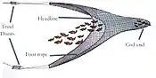 This the commonest of the towed fishing gear; it is also known as "otter trawling". Trawl nets are shaped like a funnel with the sides extended ahead to guide the fish into the net. Otter boards (sometimes called "doors") spread the towing wires and keep the net open horizontally. The mouth of the net is held open vertically by the use of floats attached to the headline, while weight distributed along the ground rope allows the net to make good contact with the sea floor. The otter boards would scrape along the seabed making noises that attract fish. The fish would congregate between the boards keeping up with them until they tired and the net would then overtake them. This method is used mainly to catch the demersal species such as cod, haddock, whiting and flatfish. The boats themselves can be less than 10 metres in length for inshore fishing to 60 metres or more for deep sea fishing.