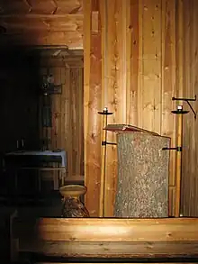 The contents of the church were sold at an auction but many objects were saved by the parishioners, who eventually began to work for a reconstruction of the church. In 1955, the Skaga foundation was formed and in the midsummer of 1960 a reconstructed church was inaugurated on the same spot. The new church had been designed based on old drawings, notes and preserved objects from the old church. Just as in the original church, a bear's hide constituted the mat, the pulpit was carved from a single large log, and a silver bleak hung above the pulpit. Finally, the locals had succeeded in fulfilling their dream of recreating their old stave church.[7]