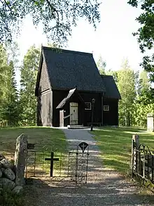 Skaga stave church is a twice rebuilt medieval stave church in Tiveden, Karlsborg Municipality, Sweden. The original chapel was built in the 1130s during the Christianization of Scandinavia, but it was demolished in 1826 to combat persistent pagan practices in the area. The locals wanted their church back and worked for it to be rebuilt. In 1960, a reconstruction was inaugurated, but it burnt down in 2000. The following year, the church was rebuilt once again.