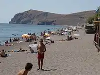The volcanic character of the west side of Lesbos is shown in the dark grey color of the beach, which extends for almost three kilometers from a small harbour in the east to the headland in the west. In 2006, the beach of Skala Eresou was awarded the Blue Flag, for the cleanliness of its waters and its beach.