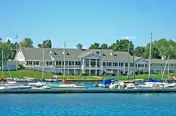 Landmarks and scenic features appear around the lake. Many historic buildings enhance the village of Skaneateles. Carpenter Falls are near the hamlet of New Hope about one mile inland from the southwest shore of the Lake. The hike down to the main waterfall from the road above is on an unimproved cliff face and quite dangerous. The falls are part of the Bahar Nature Preserve that extends along Bear Swamp Creek to the lake.[6] The historic New Hope Mill (closed to public permanently) is nearby. Opposite Carpenter Point is Ten Mile Point, a favorite picnic destination. The southern end of the lake, bounded by high hills (below, right) differs in character from the north. Glen Haven, a hamlet located there, once featured a large resort hotel but now offers smaller visitor accommodations and seasonal dining. From 1860-1900, Dr. W. C. Thomas offered a water cure treatment at the Hotel Glen Haven.[7] On the west side, the high Town of Niles, New York provides scenic prospects. On the east side, the high Town of Spafford offers panoramic views. Between these towns lies deep Glen Haven valley in the Town of Scott, New York, in the third county. The hamlet of Borodino in Spafford retains an 1830 church, little altered, in the Federal style and noted as a center of the abolitionist movement where Frederick Douglass spoke.