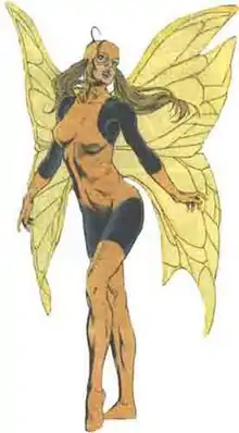 The Shroud, another fellow prisoner of Locksmith, tracked Gypsy Moth down and recruited her for the Night Shift, a band of Los Angeles-based villains. Tick-Tock, her former captor, was also a member. The Night Shift used the Los Angeles sewers to move about the city; when these sewers were overrun with the mutated test subjects of the Power Broker, the Shroud employed the Night Shift in putting an end to the Power Broker's operations.[6] She and the Night Shift battled Moon Knight in the Tower of Shadows.[7] She then served as a member of Superia's Femizons.[8] Gypsy Moth fought the second Spider-Woman (Julia Carpenter) during a fight between the Night Shift and the West Coast Avengers. Gypsy Moth asked Carpenter if she was related to the Spider-Woman she had encountered previously; Carpenter stated that she was not.[9] They realized that Satannish had taken part of their souls and fought back against him.[10]