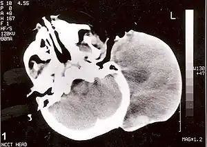 | Non-contrast CT scan of head showing a large mass without any intracranial extension. The diagnosis was post-auricular congenital alveolar rhabdomyosarcoma. | |