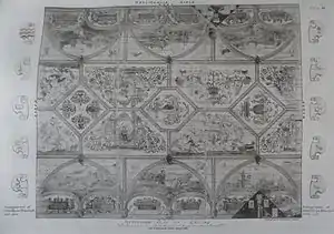 The painted timber ceiling is signed and dated 1638 by J. Stalker and is in vernacular contrast, albeit the designs are derived from the work of a goldsmith at the French royal court, Etienne Delaune.[3] Lively scenes illustrate the seasons as well as the Montgomerie and Douglas conjoined coat of arms, oddly with the quarters of the Montgomerie arms incorrectly placed as in the Polnoon example. The arms in the panel above the entrance door also have this 'mirror image' arrangement.[4] James Stalker was a former apprentice of an Edinburgh painter, John Sawers. His work seems to be otherwise unrecorded.[5]