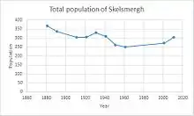 Between 1881 and 1961 the population of Skelsmergh saw an overall decrease. In 1881 the total population was 367 which showed an increase of 17 from 10 years before. However, in the following 20 years the population began to decrease, going down to 336 in 1891, then further decreasing to 303 in 1901. After rising up again to 329 in 1921, the population began to decrease again with the count being 250 in 1961.[21] When we compare this figure with the most recent Census data report for Skelsmergh in 2011, we can see that the population has seen an overall increase from 50 years previous, as the total population was recorded at 303.[22]