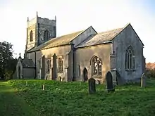 Skerne Grade I listed Anglican church is dedicated to St Leonard.[1] The church is substantially Norman, particularly the nave, chancel and south doorway. The north aisle is 13th-century. The Perpendicular tower is ashlar faced. Three interior effigies, possibly, according to Pevsner, 12th- or 13th-century, are opposite the church door: a cross-legged knight holding a small shield, a woman shown within a quatrefoil, and between these a baby.[2]