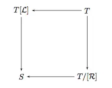 A skew lattice S is symmetric if for any , if . Occurrences of commutation are thus unambiguous for such skew lattices, with subsets of pairwise commuting elements generating commutative subalgebras, i.e., sublattices. (This is not true for skew lattices in general.) Equational bases for this subvariety, first given by Spinks[11] are: and . A lattice section of a skew lattice is a sublattice of meeting each -class of at a single element. is thus an internal copy of the lattice with the composition being an isomorphism. All symmetric skew lattices for which admit a lattice section.[10] Symmetric or not, having a lattice section guarantees that also has internal copies of and given respectively by and , where and are the and congruence classes of in . Thus and are isomorphisms.[8] This leads to a commuting diagram of embedding dualizing the preceding Kimura diagram.