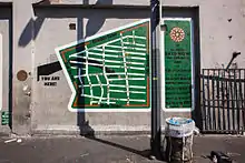 The Skid Row City Limit Mural is an 18-by-50-foot (5.5 by 15.2 m) mural displayed on San Julian Street in Los Angeles, California. It features a map demarcating Skid Row's legally recognized boundaries alongside an official-looking sign, replete with city seal, reading "Skid Row City Limit, Population: Too Many." This is the initial installation of a mural project that will eventually cover the whole wall on the San Julian block just north of 6th Street (Closest address is 570 S San Julian St).[1][2]