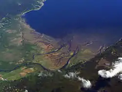 The combination of increased sediment load due to extensive clearcut logging, the reduced sediment carrying capacity due to the damming of the North Fork, and winter-weather rain patterns are suspected to be the primary reasons for the flooding that occurs almost every year on the South Fork. In late fall through early spring, storms often come from the southwest. These usually drop the most rain in the vicinity of the Skokomish River due to the topography of the Olympic Peninsula. Notably, the Skokomish Tribe, through the restoration of the Skokomish delta, (The Nallies Project), removed dikes surrounding Nallies Island, relieving some of the flooding in the valley. Recently on the second highest flood event recorded after the restoration, the flooding was only minor, compared with what it would have been before, moderate to severe flooding.[27] Additionally, it is suspected that tectonic uplift of the land around the lower Skokomish River may be contributing to flooding by decreasing the gradient of the river channel, even prior to any major anthropogenic disturbances.[28]