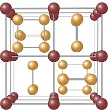 The crystal structure of the skutterudite mineral was determined in 1928 by Oftedahl[7][8] to be cubic, belonging to space group Im-3 (number 204). The unit cell can be considered to consist of eight smaller cubes made up of the Co atoms. Six of these cubes are filled with (almost) square planar rings of As, each of which is oriented parallel to one of the unit cell edges. The As atoms then form octahedra with Co in the center.