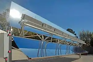 Panels—Silicon cells represent the great majority of the cost of any large conventional PV system. Skyline's design replaces most of the silicon with mirrors. Reflectors concentrate sunlight by a factor of 14, and this allows Skyline to use 1/14 as much silicon as flat panel tracking systems and 1/20 as much as non-tracking flat panel. To keep the panels operating efficiently, Skyline bonds large aluminium cooling fins to the back of each panel. If unfolded, each fin would cover an area more than 40 times larger than the face of the solar panel itself. Natural convection, aided by the wind, keeps the panels operating at temperatures comparable to conventional PV modules.