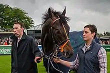 Slade Power began his three-year-old season in a handicap race over six furlongs at Cork Racecourse on 7 April. Carrying top weight of 131 pounds and ridden by Johnny Murtagh, he took the lead inside the final furlong and won by one and a quarter lengths from Nini Ok.[7] In the following month he started favourite for a race at Dundalk, but was beaten half a length by the filly Ishvanna, to whom he was conceding eight pounds. On June, Slade Power raced in England for the first time when he contested the Sandy Lane Stakes at Haydock Park Racecourse. He tracked the leaders, moved into second place a furlong out, and took the lead in the closing stages, and won by a neck from Es Que Love, with Lethal Force a length away in third.[8] On his return to Ireland, Slade Power took the Listed Belgrave Stakes at Fairyhouse over six furlongs on soft ground, taking the lead inside the final furlong and winning by half a length from Arctic with the Portland Handicap winner Santo Padre in third and Gordon Lord Byron in fourth.[9] After the race Lynam indicated that the horse would be aimed at the Haydock Sprint Cup and said He is one I am dreaming about and could be very good. I was going to bring him to Newbury yesterday (for the Hackwood Stakes) but I chickened out of it. He seemed to handle the ground well, though Wayne Lordan said he wasn't in love with it."[10] Slade Power did not race again until 20 October, when he was sent to England for the Group Two British Champions Sprint Stakes over six furlongs at Ascot Racecourse. As in many of his races, he started slowly and never looked likely to win, finishing eighth of the fifteen runners behind Maarek. Slade Power sustained a fractured pelvis in the race and, according to Lynam, his life was saved by the treatment administered by the veterinary physician Simon Knapp.[11]