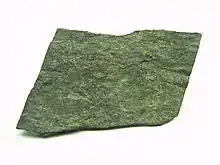 Slate is a fine-grained, metamorphic rock that shows no obvious compositional layering, but can easily be split into thin slabs and plates.[2][3] It is usually formed by low-grade regional metamorphism of mudrock.[4][5] This mild degree of metamorphism produces a rock in which the individual mineral crystals remain microscopic in size,[5] producing a characteristic slaty cleavage in which fresh cleavage surfaces appear dull. This is in contrast to the silky cleaved surfaces of phyllite, which is the next-higher grade of metamorphic rock derived from mudstone.[6] The direction of cleavage is independent of any sedimentary structures in the original mudrock, reflecting instead the direction of regional compression.[7]