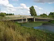 Somewhere here, the name of the river changes from the Slea to the Kyme Eau. The village of South Kyme follows, with its four-storey fortified tower, built in the 14th century for Sir Gilbert d'Umframville. It is 77 feet (23 m) high, and was surrounded by a moat.[37] Two road bridges and a footbridge cross the navigation in the village. Damford Grounds, a low-lying area of fenland, lies to the north of the village, and Damford Drain, the main drainage ditch, is pumped into the river by a pumping station on the west bank. After passing Terry Booth Farm on the east bank, the 18th century buildings of which are Grade II listed,[38] and a farm with the same name on the west bank, Lower Kyme lock is reached, 10.6 miles (17.1 km) from Sleaford. The Twenty Foot Drain and its pumping station join the river as it makes another sharp turn to the east, to reach a set of flood doors and Chapel Hill bridge, beyond which is the River Witham, flowing south-east to Boston.[33]