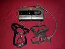 For moderate to severe sleep apnea, the most common treatment is the use of a continuous positive airway pressure (CPAP) or automatic positive airway pressure (APAP) device.[66][68] These splint the person's airway open during sleep by means of pressurized air. The person typically wears a plastic facial mask, which is connected by a flexible tube to a small bedside CPAP machine.[66]