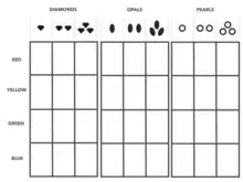 Sleuth is played with a deck of 36 Gem Cards, with each card picturing a gem (diamond, pearl, or opal), type (solitaire, pair, or cluster), and colour (red, blue, green, or yellow). A second deck of 54 Search Cards is also used, with each card representing a single element, a combination of two elements, or a free choice. One card is randomly removed from the Gem deck at the start of the game to be the missing gemstone. The remainder of the deck is split evenly among players and any cards that do not divide evenly are turned face up for all players to see. Four Search Cards are dealt face-up to each player.[2][3]