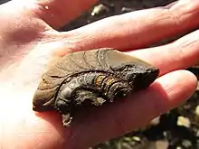 In her landmark study "The Palaeontology of the Namurian rocks of Slieve Anierin, County Leitrim, Eire", Patricia Yates (1962) demonstrated a "remarkable extent" of Namurian marine fauna bands, abundant with goniatite-Bivalvia, at Sliabh an Iarainn. [11][n 1] She described some rock layers as particularly fossiliferous,[12] the shale bands abundant with goniatite faunas and Bivalvia marine and freshwater molluscs. The unfossiliferous shales often contain numerous clay-ironstone bands making conditions intolerable for marine organisms.[13] At most of the fossiliferous levels in the Namurian beds the number of goniatites and Bivalvia are usually very high with the diversity of species low.[14] The richest and most diverse band in the succession at Sliabh an Iarainn, in terms of species present, contains Trilobites, brachiopods, gastropods, echinoids and Bryozoa.[15] Fragments of trilobites occur abundantly at particular bands.[16] Overall, Yates documented nearly 120 distinct fossiliferous sites around Sliabh an Iarainn, her work complemented by extensive photographs of often beautifully preserved fossils.[9] Her study of Sliabh an Iarainn is considered important, being housed at the Murchison Museum, Imperial College, British Geological Survey Museum, and the Natural Museum in London.[17]
