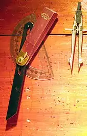 The bevel gauge is composed of two elements connected with a thumbscrew or wing nut, which allows the blade to pivot and be locked at any angle. The handle is usually made of wood or plastic and the blade of metal. The bevel can be used to duplicate an existing angle, or set to a desired angle by using it with any number of other measuring tools (such as a protractor, or framing square).[2]