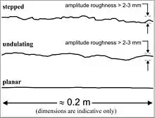 The second term is established visually. The trace (with a length of about 0.2 m) or surface (with an area of about 0.2 x 0.2 m2 of a discontinuity is compared with the example graphs in figure 2; this gives stepped, undulating, or planar. The two terms of visual and tactile give a combined term and the corresponding factor is listed in table 1.