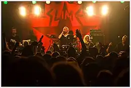 Although initially playing in the straightforward style of late 70's British punk, Slime developed their own unique style of punk rock, which has been seminal for Deutschpunk. Slime's songs involve complex song structures with layered, sophisticated lyrics, that often include an element of story-telling. The main themes in Slime's music are political resistance to racism, xenophobia, homophobia, and fascism.[3] Their political activism on these topics has strongly influenced the German punk movement in general. The band describes their music as protest songs.[4][5] In the 1980s they were associated with the anti-nuclear and squatting movements.[6] Their anti-police songs continue to be anthems of leftist political movements,[7] and have translated into slogans that are widely used, for example, in graffiti and stickering campaigns.
