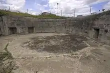 Two new 9.2-inch guns were installed in 1906 in the western wing battery. They were mounted on barbettes, enabling them to recoil along their axis and so delivering a much faster rate of fire. One 9.2-inch and one 6-inch gun on a disappearing mounting remained in the eastern wing battery before being removed in 1907.[1][3] During the war the fort was used as a Battery Command Post operating in conjunction with a Port War Signal Station located to the fort's east, which was responsible for monitoring all shipping entering or leaving the Thames.[1] The remaining two 9.2-inch guns were removed in 1917 and reinstalled at Fletcher Battery, a newly built position on the Isle of Sheppey.[7]