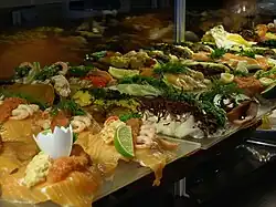 Smørrebrød (Danish pronunciation: [ˈsmɶɐ̯ˌpʁœðˀ]; originally smør og brød, "butter and bread"[1]) smørbrød "butter bread" (Norwegian), is a traditional open-faced sandwich[2] in the cuisines of Denmark, Norway and Sweden that usually consists of a piece of buttered rye bread (rugbrød, a dense, dark brown bread), topped with commercial or homemade cold cuts, pieces of meat or fish, cheese or spreads, and garnishes.