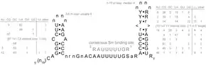 ![]() Consensus secondary structure of SmY RNAs. A count of base pair substitutions observed in 68 structurally aligned sequences in the Rfam seed alignment is shown for each base pair, illustrating the extensive support for this predicted structure.[1] | |