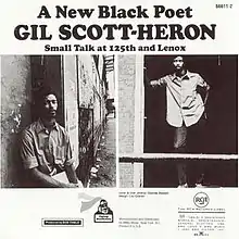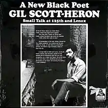 A New Black Poet - Small Talk at 125th and Lenox, also known simply as Small Talk at 125th and Lenox,[5] is the debut album of recording artist Gil Scott-Heron, released in 1970 on Flying Dutchman Records.[6] Recording sessions for the album were originally said to have taken place live at a New York nightclub located on the corner of 125th Street and Lenox Avenue,[5] but liner notes included in the 2012 box set The Revolution Begins: The Flying Dutchman Masters, Scott-Heron himself insists that a small audience was brought to 'the studio' and seated on 'folding chairs'.[7] By the time of the recordings, Scott-Heron had published a volume of poetry and his first novel, The Vulture.[8] Well received by music critics who found Scott-Heron's material imaginative,[2][3] Small Talk at 125th and Lenox has been described as "a volcanic upheaval of intellectualism and social critique" by Allmusic editor John Bush.[1]