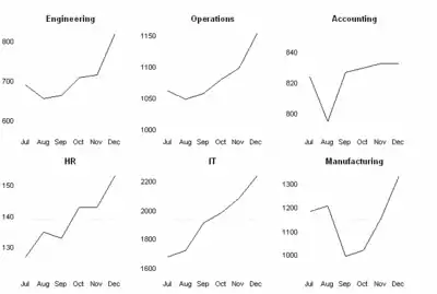 In the example, the departmental salary expense is charted by month with a dashed line indicating the average for each department. The scales on each panel are different to emphasize the relative change over time compared to the range. Standardizing the scales could provide insight into comparisons in magnitude between the different departments. Two independent Y axes may be utilized when presenting data with different numeric scales in each panel.[2][3]