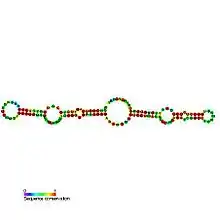 In molecular biology, small nucleolar RNA SNORA10 and small nuclear RNA SNORA64 are homologous members of the H/ACA class of small nucleolar RNA (snoRNA). This family of ncRNAs involved in the maturation of ribosomal RNA.[1] snoRNA in this family act as guides in the modification of uridines to pseudouridines.[2] This family includes the human snoRNAs U64 and ACA10 and mouse MBI-29.[3][4][5]