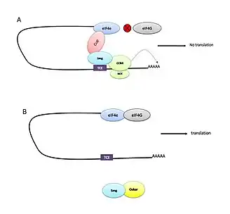- Zaessinger, Sophie; Busseau, Isabelle; Simonelig, Martine (November 2006). "Oskar allows nanos mRNA translation in Drosophila embryos by preventing its deadenylation by Smaug/CCR4". Development. 133 (22): 4573–4583. doi:10.1242/dev.02649. ISSN 0950-1991. PMID 17050620.