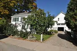 The Smith–Emery House is set on the north side of Main Street, between it and Springvale's mill pond. It is a 2+1⁄2-story wood-frame structure, five bays wide, with a side-gable roof, clapboard siding, and a granite foundation. A two-story ell extends to the rear of the main block, connecting it to a barn that is offset to the right. The main (south-facing) facade is symmetrically arranged, with the entrance in a projecting gable-roofed vestibule. The entrance is framed by pilasters at the sides and four-light transom window above. The building interior follows a typical center-chimney plan, with a narrow winding stair in the entry, and parlors to either side. Interior finishes are Greek Revival, and fairly modest.[2]