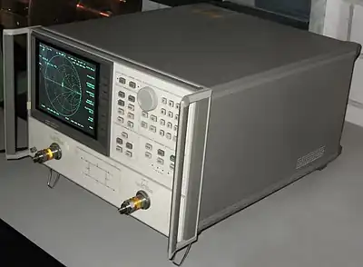 The Smith chart, invented by Phillip H. Smith (1905–1987)[1][2] and independently[3] by Mizuhashi Tosaku,[4] is a graphical calculator or nomogram designed for electrical and electronics engineers specializing in radio frequency (RF) engineering to assist in solving problems with transmission lines and matching circuits.[5][6] The Smith chart can be used to simultaneously display multiple parameters including impedances, admittances, reflection coefficients, scattering parameters, noise figure circles, constant gain contours and regions for unconditional stability, including mechanical vibrations analysis.[7][8]: 93–103 The Smith chart is most frequently used at or within the unity radius region. However, the remainder is still mathematically relevant, being used, for example, in oscillator design and stability analysis.[8]: 98–101 While the use of paper Smith charts for solving the complex mathematics involved in matching problems has been largely replaced by software based methods, the Smith chart is still a very useful method of showing[9] how RF parameters behave at one or more frequencies, an alternative to using tabular information. Thus most RF circuit analysis software includes a Smith chart option for the display of results and all but the simplest impedance measuring instruments can plot measured results on a Smith chart display.[10]