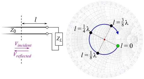 This equation shows that, for a standing wave, the complex reflection coefficient and impedance repeats every half wavelength along the transmission line. The complex reflection coefficient is generally simply referred to as reflection coefficient. The outer circumferential scale of the Smith chart represents the distance from the generator to the load scaled in wavelengths and is therefore scaled from zero to 0.50 .