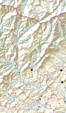 The creek watershed is designated by the United States Geological Survey as sub-watershed HUC 031300010102, is named Smith Creek-Chattahoochee River sub-watershed, and drains an area of approximately 27 square miles north of Helen, and east of the Chattahoochee River. In addition to Smith Creek, the area is drained by Spoilcane Creek to the west of Smith Creek, which is 5.67 miles (9.12 km) long,[1] and Horton Creek to its south, which is 2.66 miles (4.28 km) long,[1] both of which flow into Smith Creek on its way to the Chattahoochee.[4]