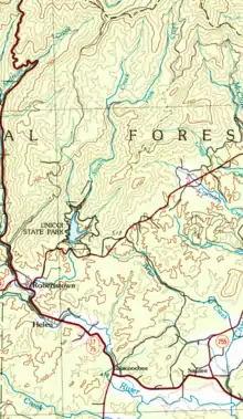 Smith Creek rises in the very northeastern corner of White County, Georgia, where White County meets Habersham County, on the western edge of Hickorynut Ridge, and south of Tray Mountain, at the base of Anna Ruby Falls and the confluence of York Creek and East Fork Smith Creek.[3] The creek runs south and forms Unicoi Lake, a reservoir created by Unicoi State Park Lake Dam, a United States Army Corps of Engineers project in Unicoi State Park, then turns sharply west and flows into the Chattahoochee River in northern Helen, right off of State Route 75.[4]