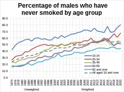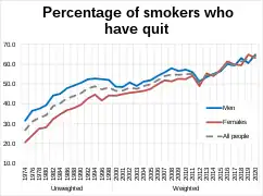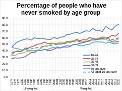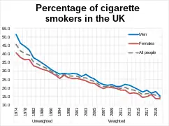 In 1962, over 70% of British men and 40% of British women smoked.[1] As recently as 1974, 45% of the British population smoked. This was down to 30% by the early 1990s, 21% by 2010, and 19.3% by 2013, the lowest level recorded for eighty years.[2] An annual No Smoking Day has occurred in March since 1984.[3]