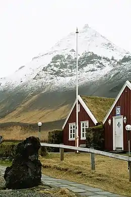 The Snæfellsjökull volcano, regarded as one of the symbols of Iceland, can be found in the area. With its height of 1,446 m (4,744 ft), it is the highest mountain on the peninsula and has a glacier at its peak (jökull means "glacier" in Icelandic). The volcano can be seen on clear days from Reykjavík, a distance of about 120 km (75 mi). The mountain is also known as the setting of the novel Journey to the Center of the Earth by the French author Jules Verne. The area surrounding Snæfellsjökull has been designated one of the four National Parks by the government of Iceland. It is also the home of the Ingjaldsholl church, a Protestant church.[1]