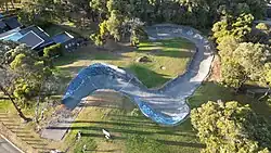 The run is made from concrete and is 140 metres (459 ft) in length running downhill.[4] The track is curved downward and lipped with a wall on first turn with lower rises on the next two turns and finishing with a drained bowl at the end.