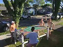 | Materials required | Plywood table, pint glasses or solo cups, dice |