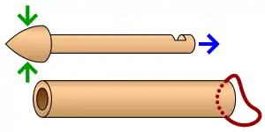 A snapper is a mechanical puzzle consisting of a pointed piece attached to a notched dowel and a hollow block with a secondary hole along its length through which a rubber-band is stretched (across the shaft) and tied off. A demonstrator inserts the dowel into the hollow block, hooks the rubber-band on the notch, pulls on the pointed end, and allows the dowel to snap back into place. The demonstrator hands the puzzle to an observer who cannot hook the rubber-band onto the dowel's notch. The demonstrator takes the puzzle back and makes it snap immediately. The trick is that the ends of the dowel are tapered so that the demonstrator can squeeze the fingers holding it together, causing it to snap into the block.