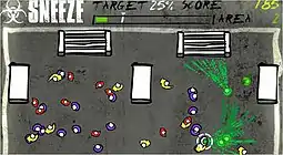 Sneeze is a browser game made in Adobe Flash. Players control their avatar and have only one sneeze, which they must use to infect as many people as possible.[2] Infected people turn green and sneeze in turn, infecting more people. Players are awarded points based on how many people were infected, with bonus points awarded for infecting children and elderly people. If they infect enough people, the player progresses to the next level. Examples of levels include a pedestrian-filled street, a train station, and a nursery school. Virus-related factoids appear in between levels.[1]