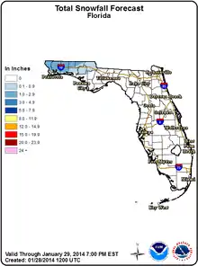 Snowfall forecast for 28–29 January 2014, predicting over 1 inch of snow in northwest Florida. - January 28–29, 2014: A major winter storm event resulted in a mixture of freezing rain (with ice accumulation), sleet, and snow across most of the Panhandle between the afternoon of the 28th and morning of the 29th. Due to dangerous ice accumulation, the Florida Highway Patrol and FDOT closed several bridges in the Panhandle and advised against non-essential travel.[54] Many state and local government offices were closed around mid-day on the 28th.[55] In Santa Rosa county, officials cautioned that ice-laden tree limbs were hanging low enough to hit vehicles.[56] Between 1 and 9:30 PM on the 28th, 21,633 Gulf Power customers lost power at some point.[57] At 2 PM EST on January 28, Pensacola was 31 °F (−1 °C) with freezing rain while Immokalee, near Fort Myers, was 86 °F (30 °C). Pensacola received 1.8 inches (46 mm) of snow on January 28.[58] On January 29, the Florida Highway Patrol closed nearly 200 miles (320 km) of Interstate 10 from the Florida-Alabama state line to Gadsden County, directing resources and traffic to U.S. 90.[59] Pensacola International Airport closed at 9:17 PM January 28 and was not scheduled to reopen until late on the 29th.[60]