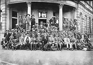In response to these embarrassing recruitment shortfalls, some New South Wales residents launched a series of snowball recruiting marches, which were intended to encourage men to enlist through the marchers' example. The first march was a locally based initiative led by the captain of the local Rifle Club in October 1915; eight other marches were known to have taken place over the next four months. Military authorities were initially ambivalent about the marches; they were not certain whether or not the men should march with rifles, when their pay would start, and who would clothe or feed them. Along the route however, local communities fed and housed the men, and the marches gained tremendous publicity.[1] About 1,500 men marched in total, and they are credited by some sources with persuading anywhere from two to three times that number to enlist as a result.[1][2]