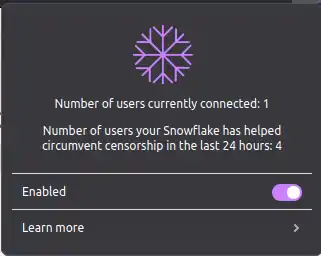 Snowflake is a software package for assisting others in circumventing internet censorship by relaying data requests. Snowflake relay nodes are meant to be created by people in countries where Tor and Snowflake are not blocked.[1] People under censorship then use a Snowflake client, packaged with the Tor Browser or Onion Browser,[2] to access the Tor network, using Snowflake relays as proxy servers. Access to the Tor network can in turn give access to other blocked services (like blocked websites).[1] A Snowflake node can be created by either installing a browser extension, installing a stand-alone program, or browsing a webpage with an embedded Snowflake relay. The node runs whenever the browser or program is connected to the internet.